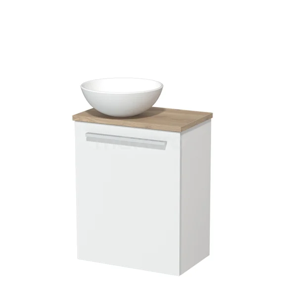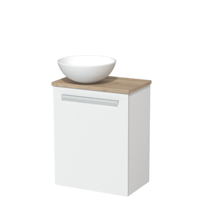 WC-Möbel mit Aufsatzwaschbecken | 41 cm Matt Weiß Glatte Front Matt Weiß Keramik-Aufsatzwaschbecken Hellbraune Eiche Platte