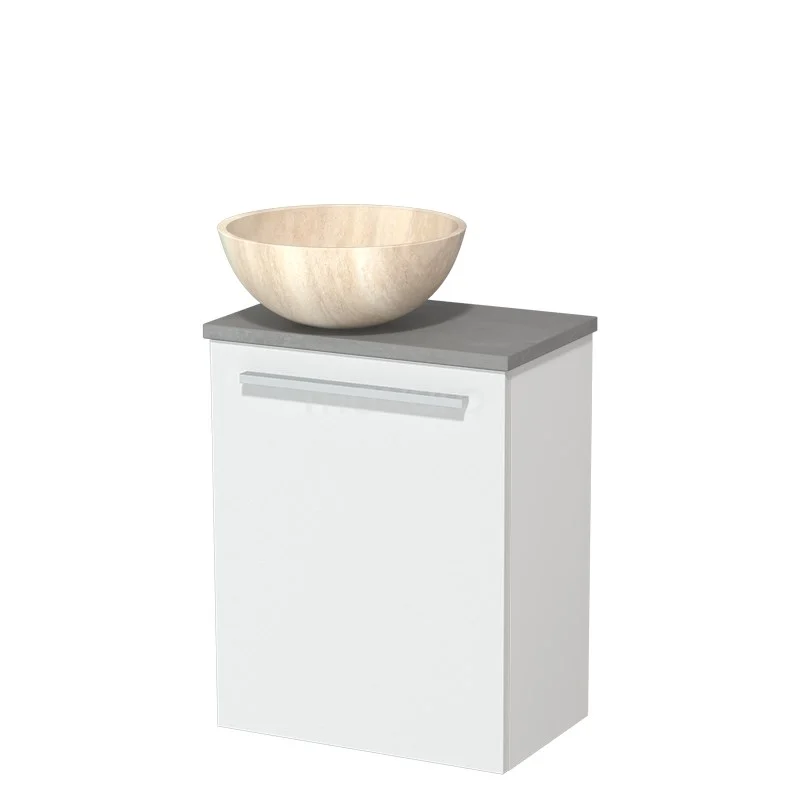 WC-Möbel mit Aufsatzwaschbecken | 41 cm Matt Weiß Glatte Front Travertin Naturstein-Aufsatzwaschbecken Hellgrauer Beton Platte
