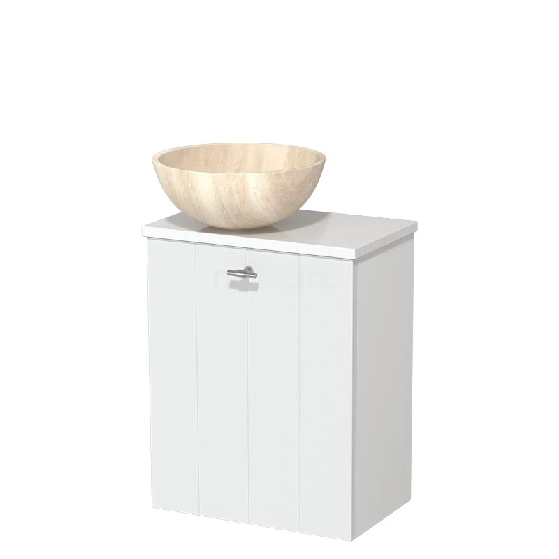 WC-Möbel mit Aufsatzwaschbecken | 41 cm Matt Weiß Lamellen Front Travertin Naturstein Aufsatzwaschbecken Hochglanz Weiß Platte