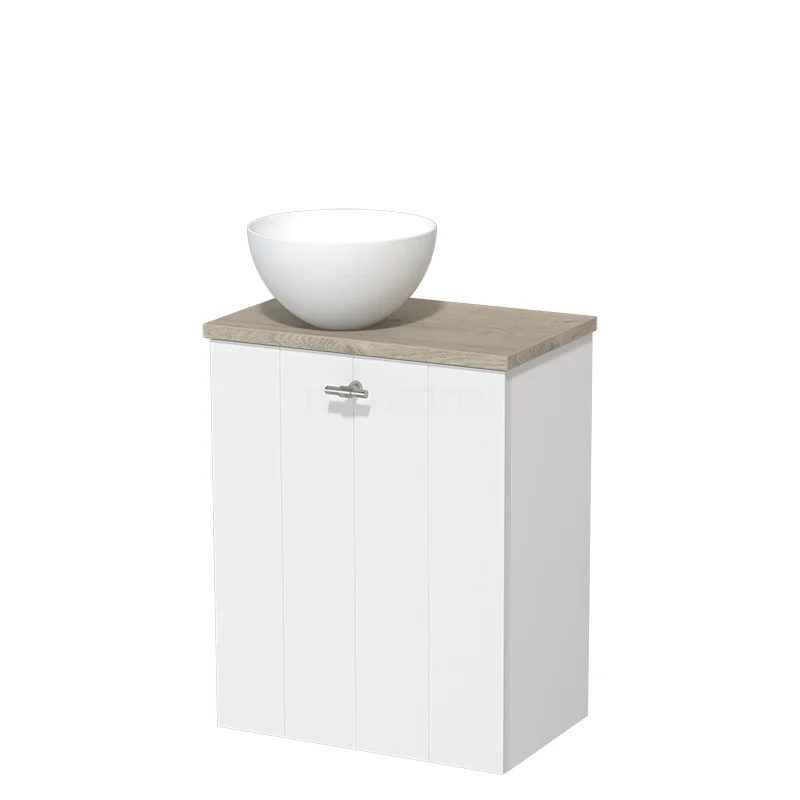 WC-Möbel mit Aufsatzwaschbecken | 41 cm Matt Weiß Lamellenfront Matt Weiß Aufsatzwaschbecken Solid Surface Hellgraue Eiche Platte