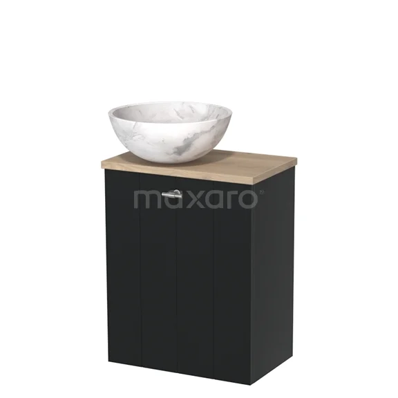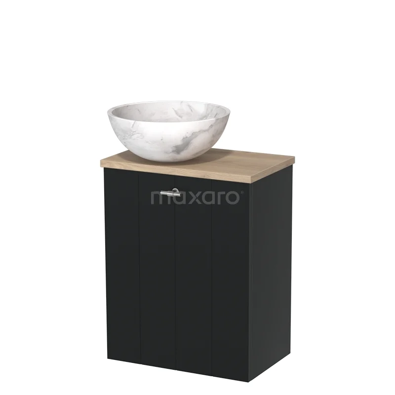 WC-Möbel mit Aufsatzwaschbecken | 41 cm Mattschwarze Lamellenfront Weißer Marmor Naturstein Aufsatzwaschbecken Hellbraune Eiche Platte