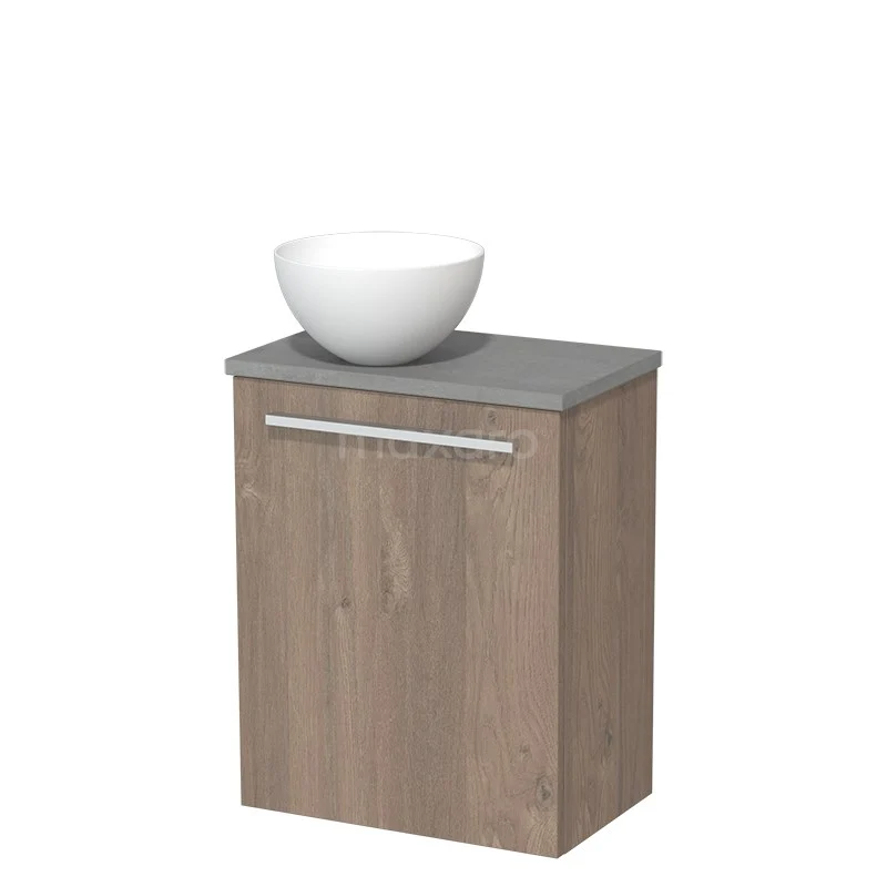 WC-Möbel mit Aufsatzwaschbecken | 41 cm mittelbraune Eiche glatte Front Matt Weiß Solid Surface Aufsatzwaschbecken hellgrauer Beton
