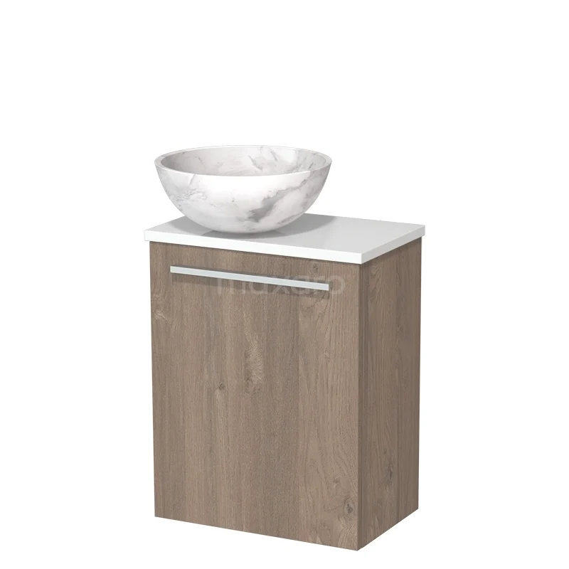 WC-Möbel mit Aufsatzwaschbecken | 41 cm Mittelbraune Eiche Glatte Front Weißer Marmor Naturstein Aufsatzwaschbecken Hochglanz Weiß