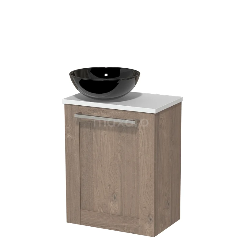 WC-Möbel mit Aufsatzwaschbecken | 41 cm Mittelbraune Eiche Rahmenfront Hochglanz Schwarz Keramik-Aufsatzwaschbecken Matt Weiß Platte