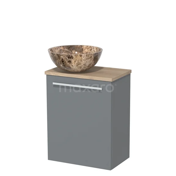 WC-Möbel mit Aufsatzwaschbecken | 41 cm Mittelgrau Glatte Front Dunkle Emperador Naturstein-Aufsatzwaschbecken Hellbraune Eiche Platte