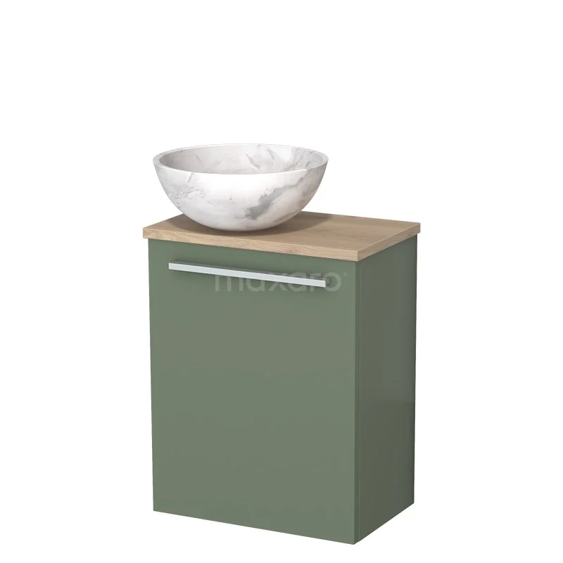 WC-Möbel mit Aufsatzwaschbecken | 41 cm Salbeigrün Flache Front Weißer Marmor Naturstein Aufsatzwaschbecken Hellbraune Eiche Platte