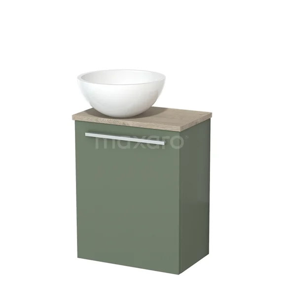 WC-Möbel mit Aufsatzwaschbecken | 41 cm Salbeigrün Glatte Front Hochglanz Weiß Mineralguss Aufsatzwaschbecken Hellgraue Eiche Platte