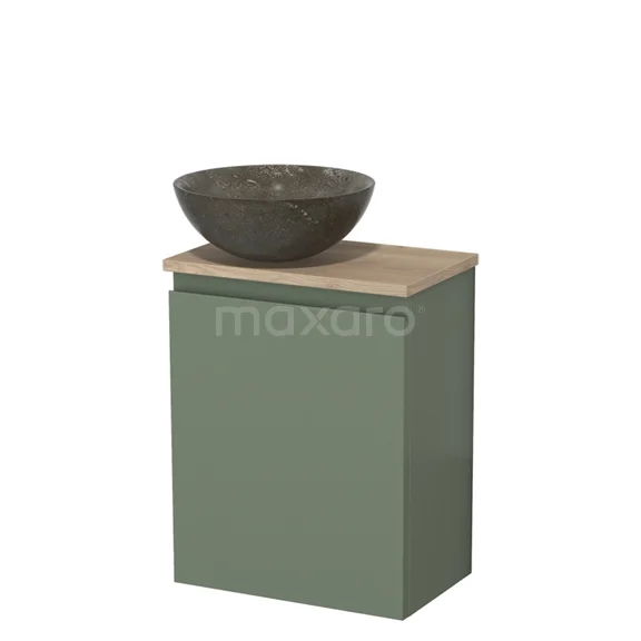 WC-Möbel mit Aufsatzwaschbecken | 41 cm Salbeigrün Grifflose Front Blaustein Naturstein Aufsatzwaschbecken Hellbraune Eiche Platte