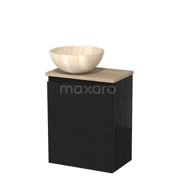 WC-Möbel mit Aufsatzwaschbecken | 41 cm Schwarze Eiche Grifflose Front Travertin Naturstein Aufsatzwaschbecken Hellbraune Eiche Platte