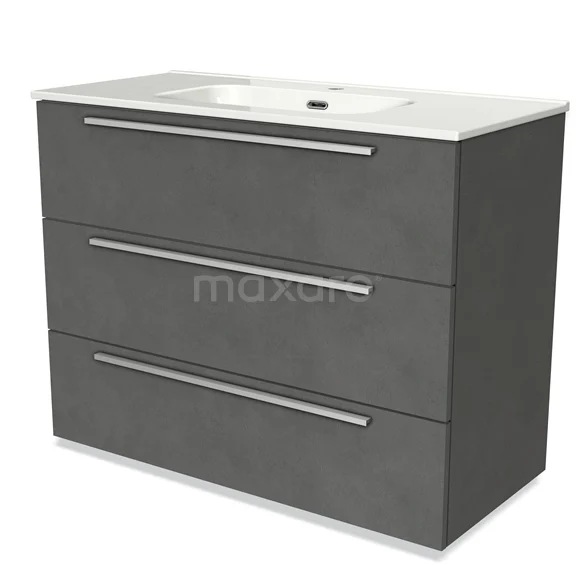 Badmöbel 100cm Modulo Dunkelgrau Beton 3 Schubladen Flaches Waschbecken aus Keramik