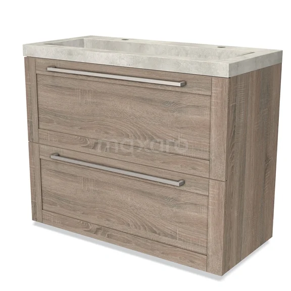 Badmöbel 100cm Modulo Eiche 2 hohe Schubladen Rahmen Waschbecken Beton