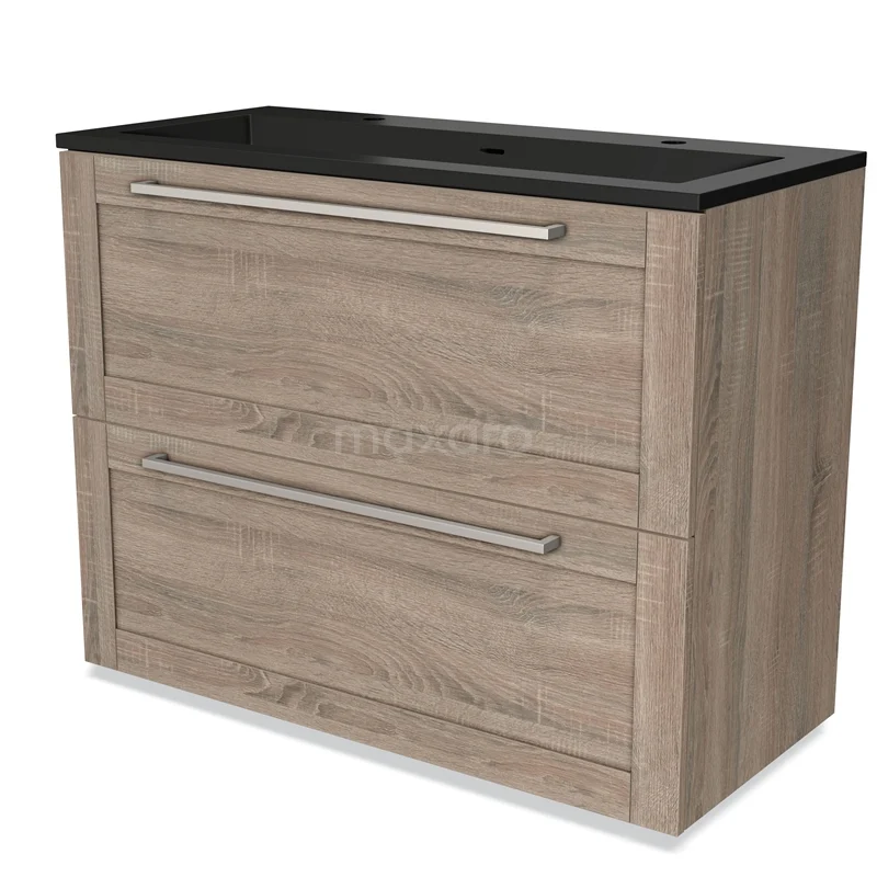 Badmöbel 100cm Modulo Eiche 2 hohe Schubladen Rahmen Waschbecken Quarz