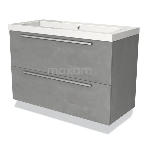 Badmöbel 100cm Modulo hellgrauer Beton 2 Schubladen Flaches Waschbecken Mineralguss Marmor
