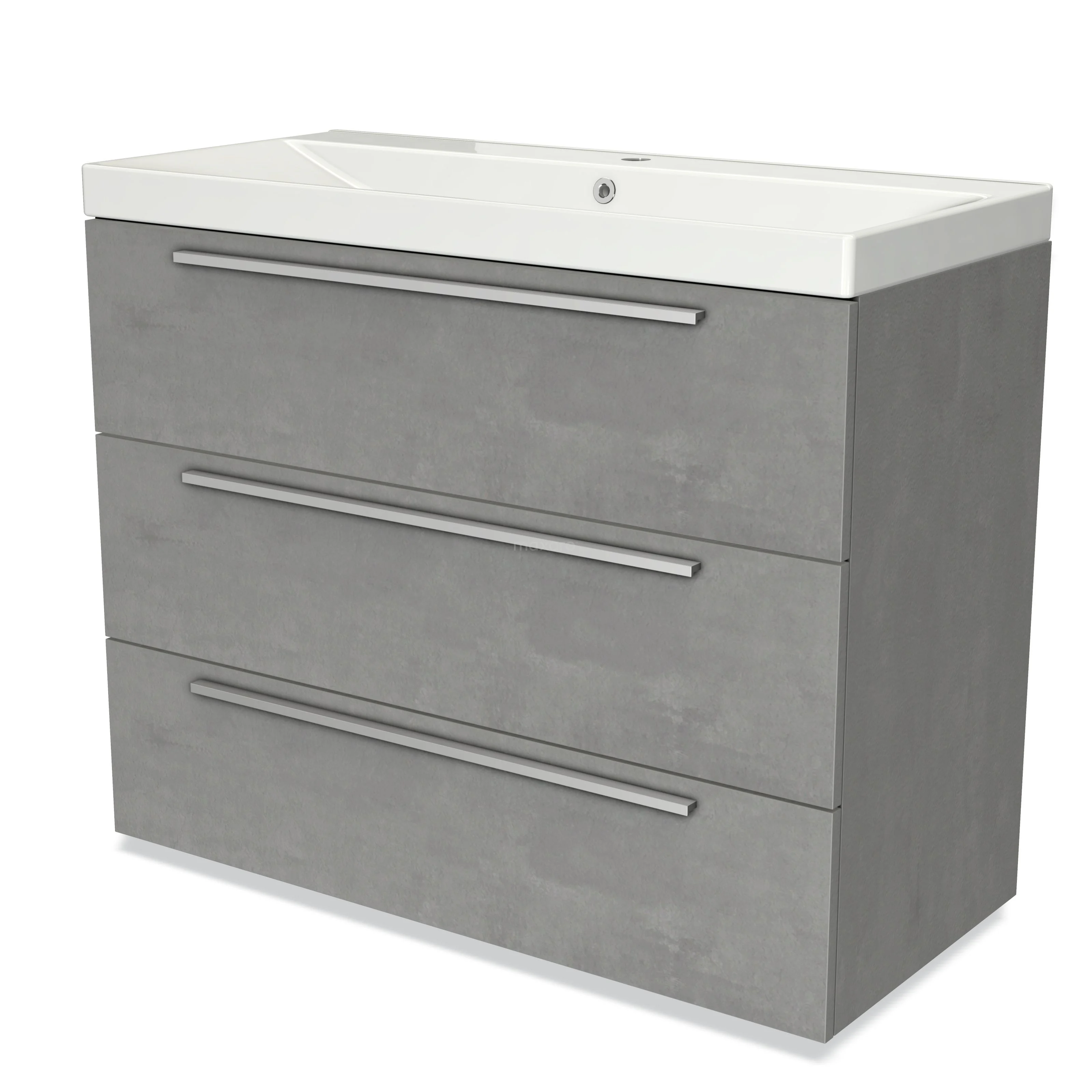 Badmöbel 100cm Modulo hellgrauer Beton 3 Schubladen Flaches Waschbecken aus Keramik