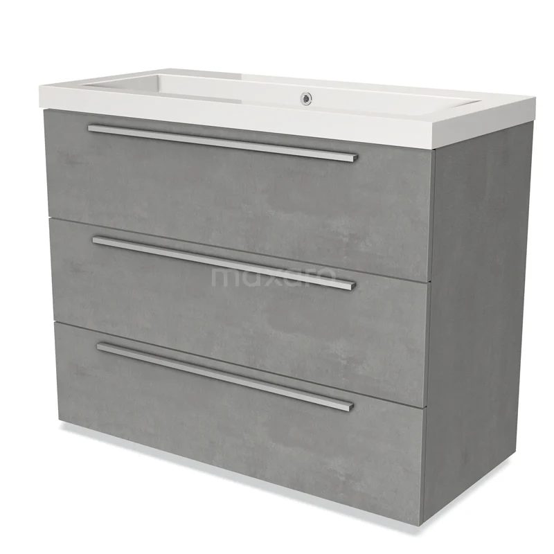 Badmöbel 100cm Modulo hellgrauer Beton 3 Schubladen Flaches Waschbecken Mineralguss Marmor