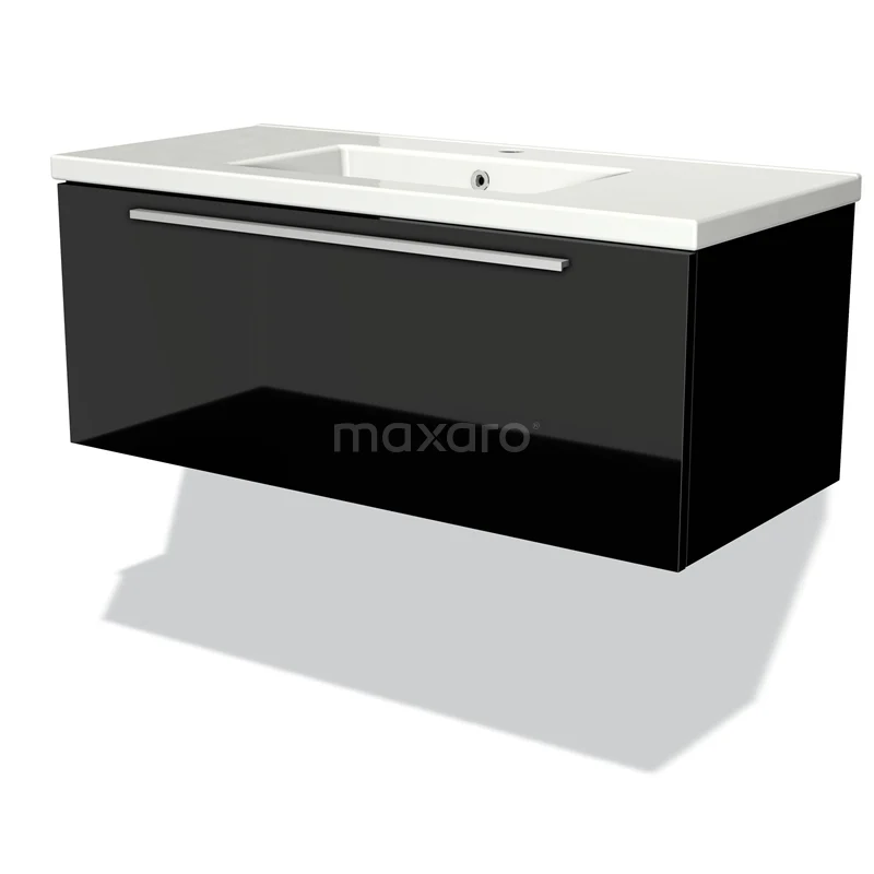 Badmöbel 100cm Modulo Hochglanz Schwarz 1 Schublade Flaches Waschbecken aus Keramik