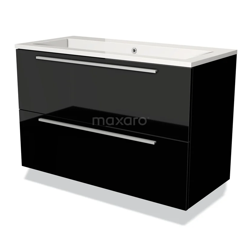 Badmöbel 100cm Modulo Hochglanz Schwarz 2 Schubladen Flaches Waschbecken Mineralguss