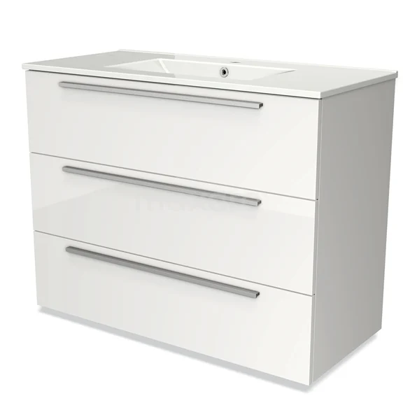 Badmöbel 100cm Modulo Hochglanz Weiß 3 Schubladen Flaches Waschbecken aus Keramik