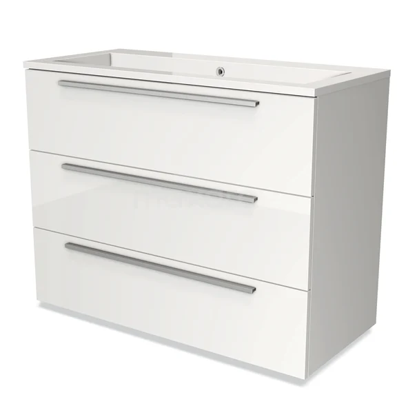 Badmöbel 100cm Modulo Hochglanz Weiß 3 Schubladen Flaches Waschbecken Mineralguss