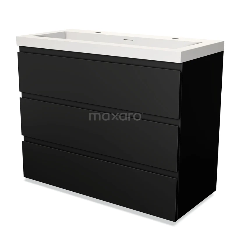 Das bodenstehende Badmöbel (100 cm) ist das Herzstück für die tägliche Körperpflege wie Schminken, Rasieren oder Zähneputzen. Das Waschbecken hat 2 Hahnlöcher und ist ideal für die gleichzeitige Nutzung durch mehrere Personen. Das Möbel bietet außerdem genügend Platz, um Ihre WC- und Pflegeprodukte ordentlich zu verstauen.