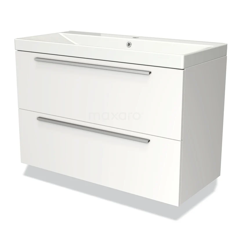 Badmöbel 100cm Modulo Matt Weiß 2 Schubladen Flaches Waschbecken aus Keramik