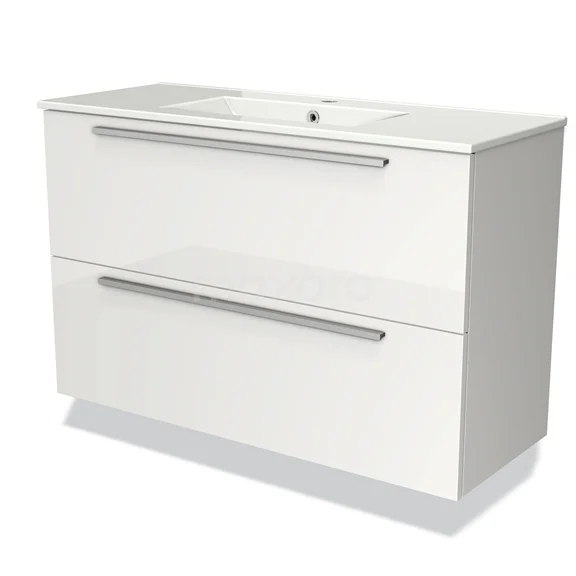 Badmöbel 100cm Modulo Slim Hochglanz Weiß 2 Schubladen Flaches Waschbecken aus Keramik