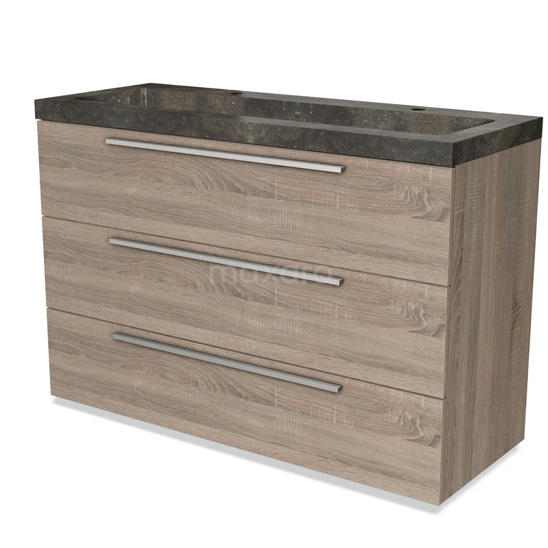 Badmöbel 120cm Modulo Eiche 3 Schubladen Flaches Waschbecken Naturstein Blaustein