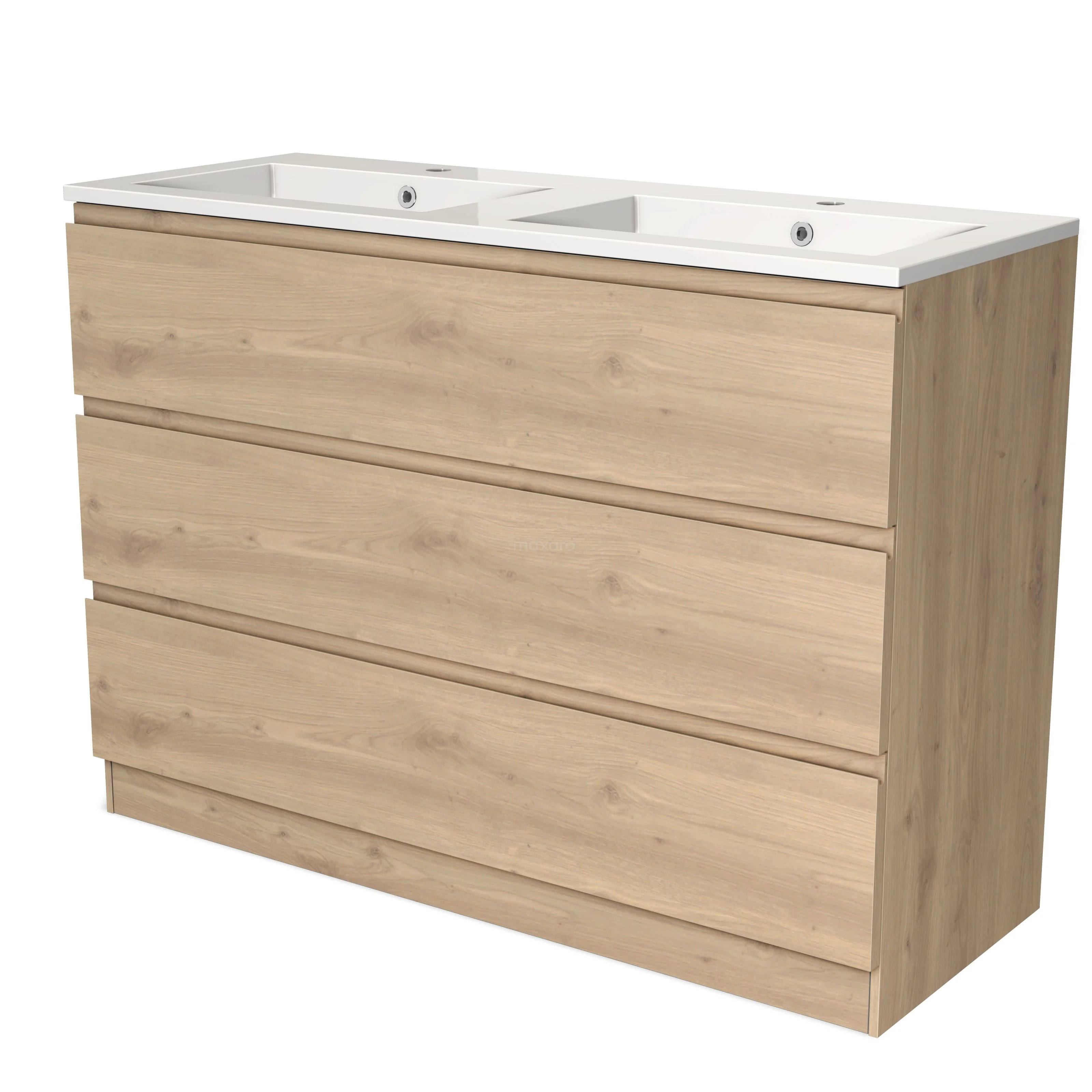 Das bodenstehende Badmöbel (120 cm) ist das Herzstück für die tägliche Körperpflege wie Schminken, Rasieren oder Zähneputzen. Das Waschbecken hat 2 Hahnlöcher und ist ideal für die gleichzeitige Nutzung durch mehrere Personen. Das Möbel bietet außerdem genügend Platz, um Ihre WC- und Pflegeprodukte ordentlich zu verstauen.