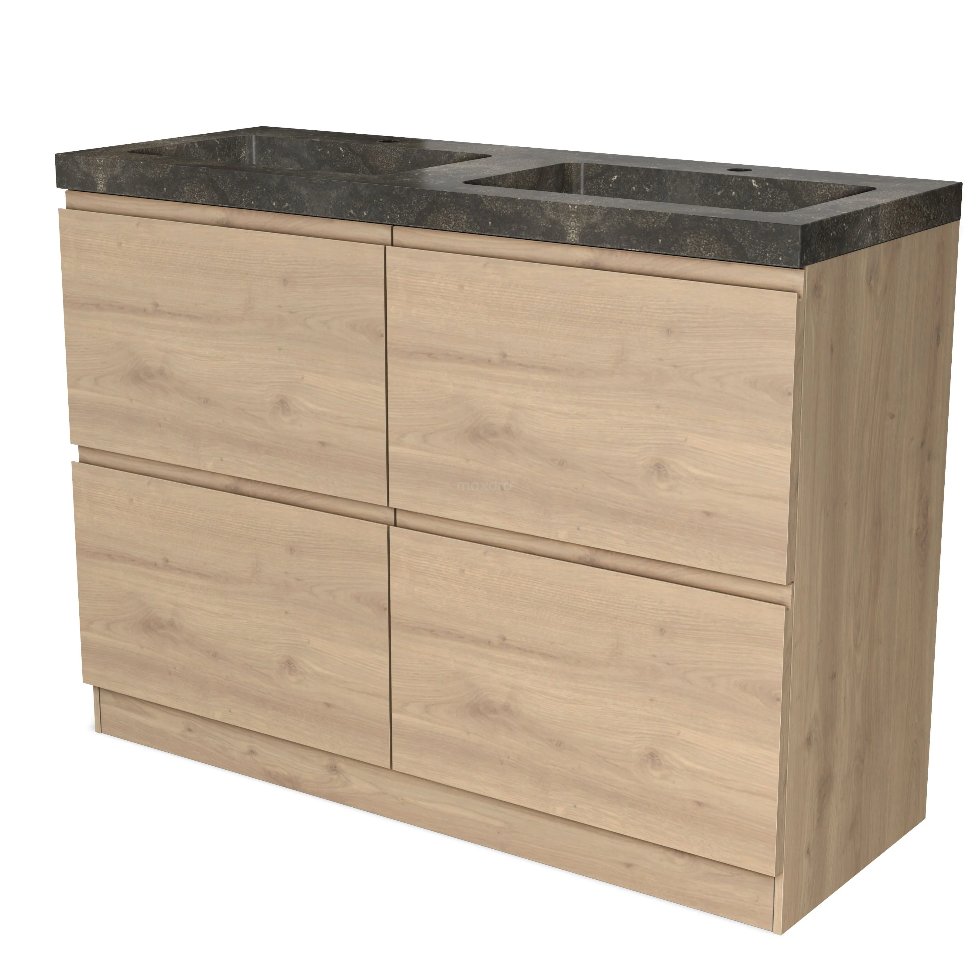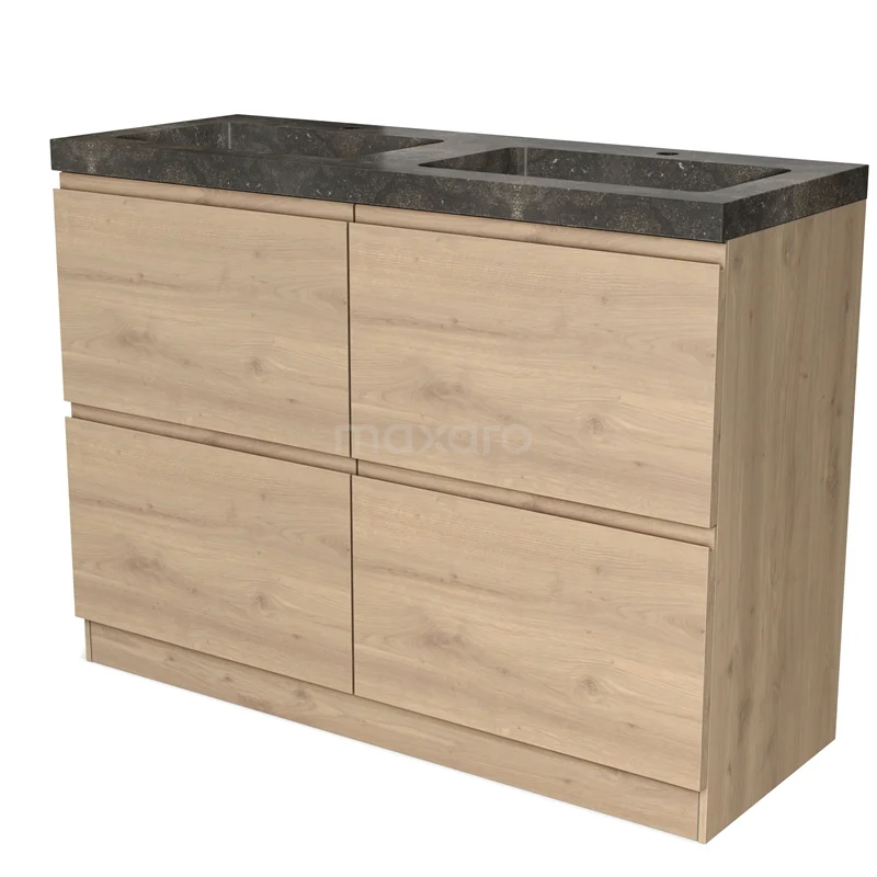 Badmöbel 120cm Modulo Hellbraune Eiche 4 hohe Schubladen Stehendes griffloses Waschbecken Naturstein Blaustein
