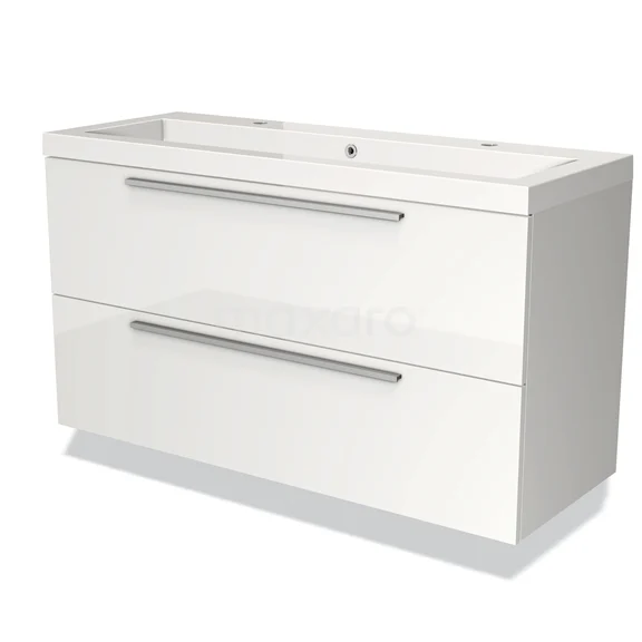 Badmöbel 120cm Modulo Hochglanz Weiß 2 Schubladen Flaches Waschbecken Mineralguss