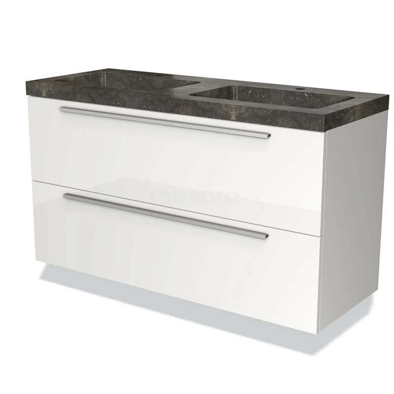 Badmöbel 120cm Modulo Hochglanz Weiß 2 Schubladen Flaches Waschbecken Naturstein Blaustein