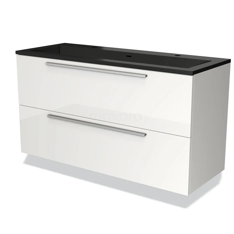 Badmöbel 120cm Modulo Hochglanz Weiß 2 Schubladen Flaches Waschbecken Quarz