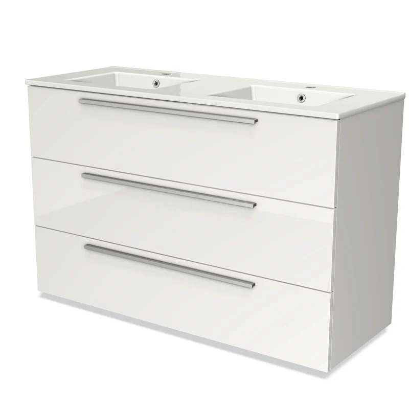 Badmöbel 120cm Modulo Hochglanz Weiß 3 Schubladen Flaches Waschbecken aus Keramik
