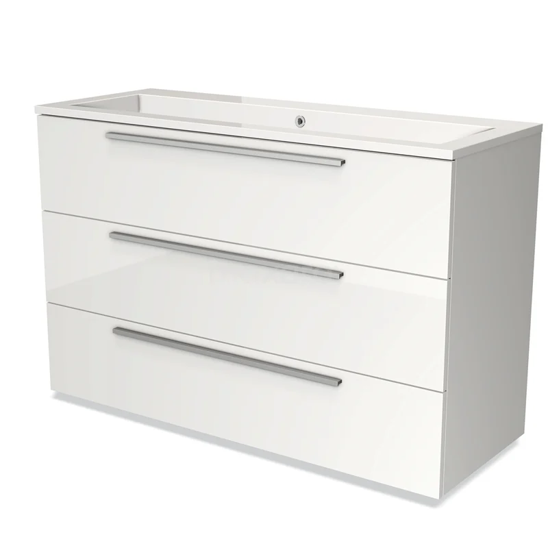 Badmöbel 120cm Modulo Hochglanz Weiß 3 Schubladen Flaches Waschbecken Mineralguss