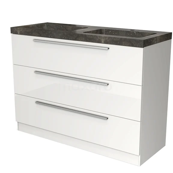 Badmöbel 120cm Modulo Hochglanz Weiß 3 Schubladen Stehendes Waschbecken Naturstein Blaustein