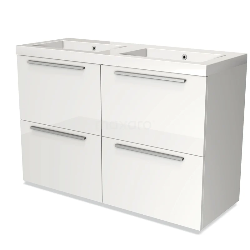 Badmöbel 120cm Modulo Hochglanz Weiß 4 hohe Schubladen Flaches Waschbecken Mineralguss