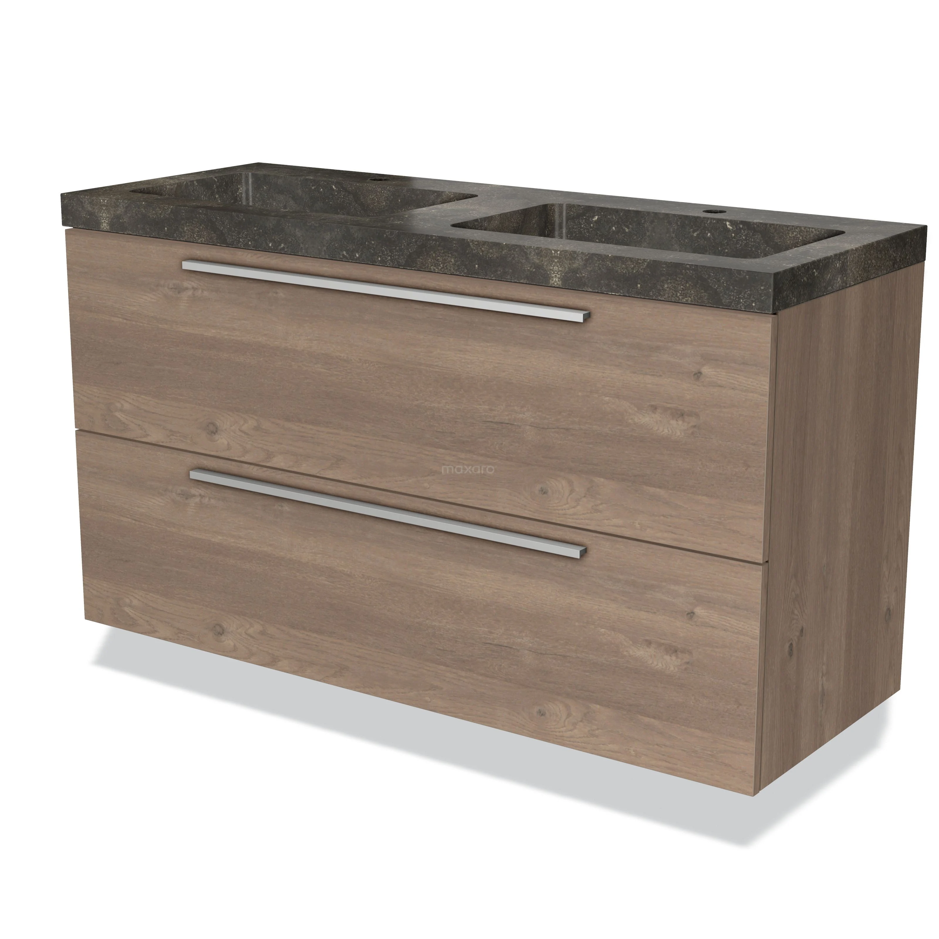 Badmöbel 120cm Modulo mittelbraune Eiche 2 Schubladen Flaches Waschbecken Naturstein Blaustein