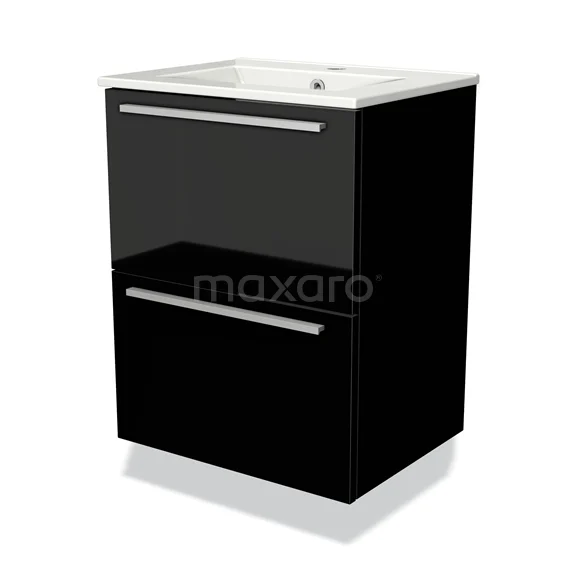 Badmöbel 50cm Modulo Slim Hochglanz Schwarz 2 Schubladen Flaches Waschbecken aus Keramik