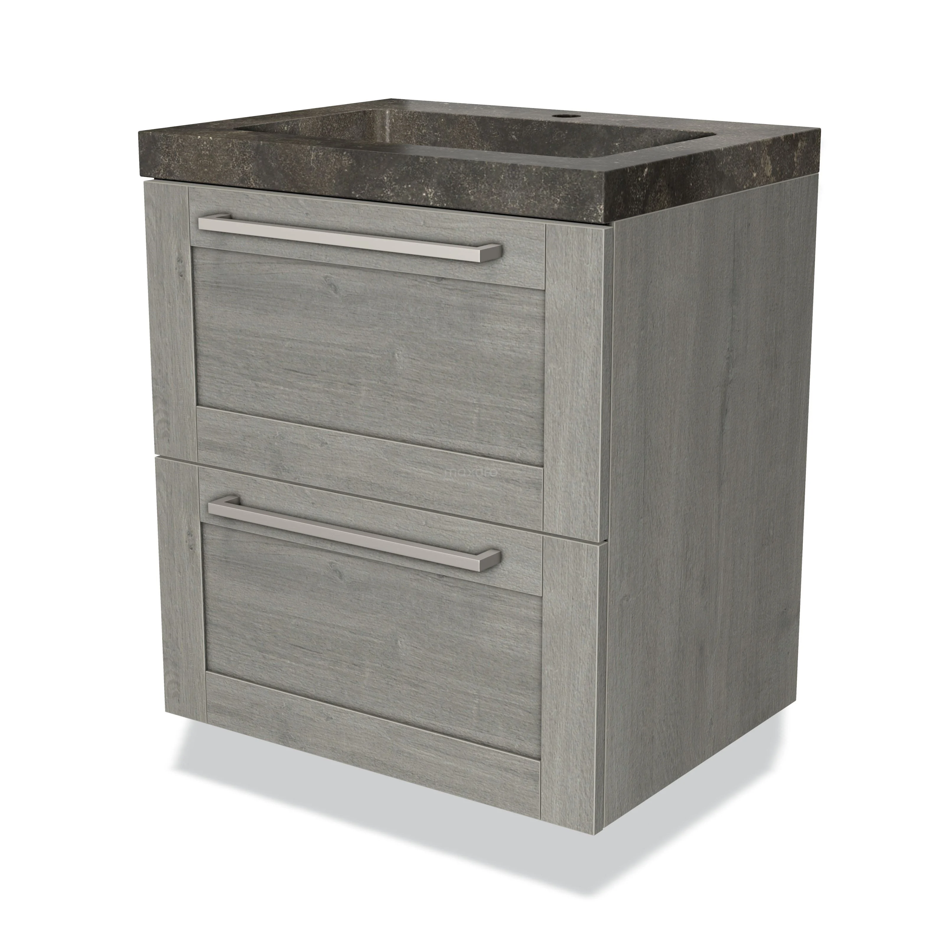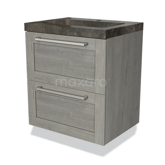 Badmöbel 60cm Modulo Graue Eiche 2 Schubladen Rahmen Waschbecken Naturstein Blaustein