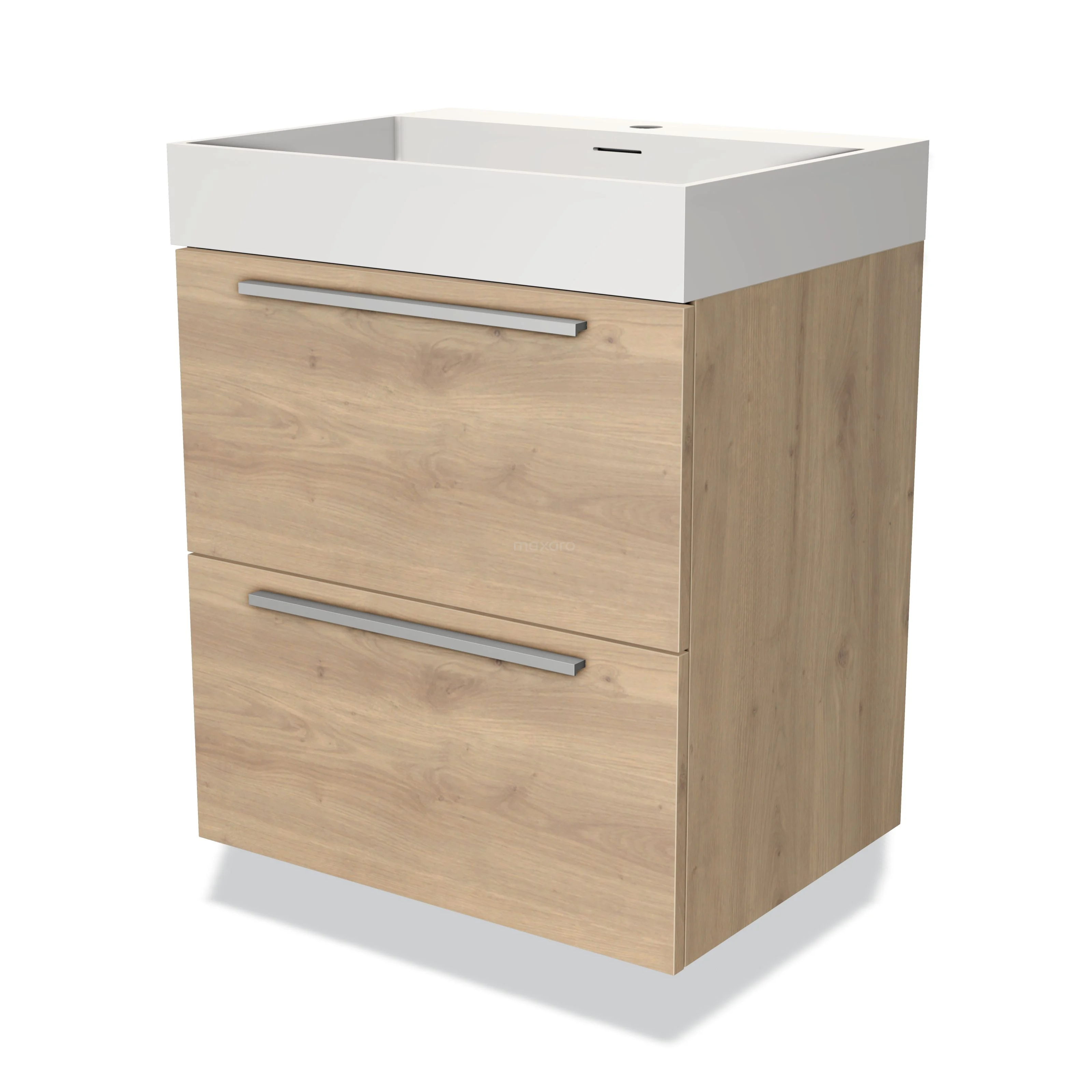 Badmöbel 60cm Modulo Hellbraune Eiche 2 Schubladen Flaches Waschbecken Solid Surface