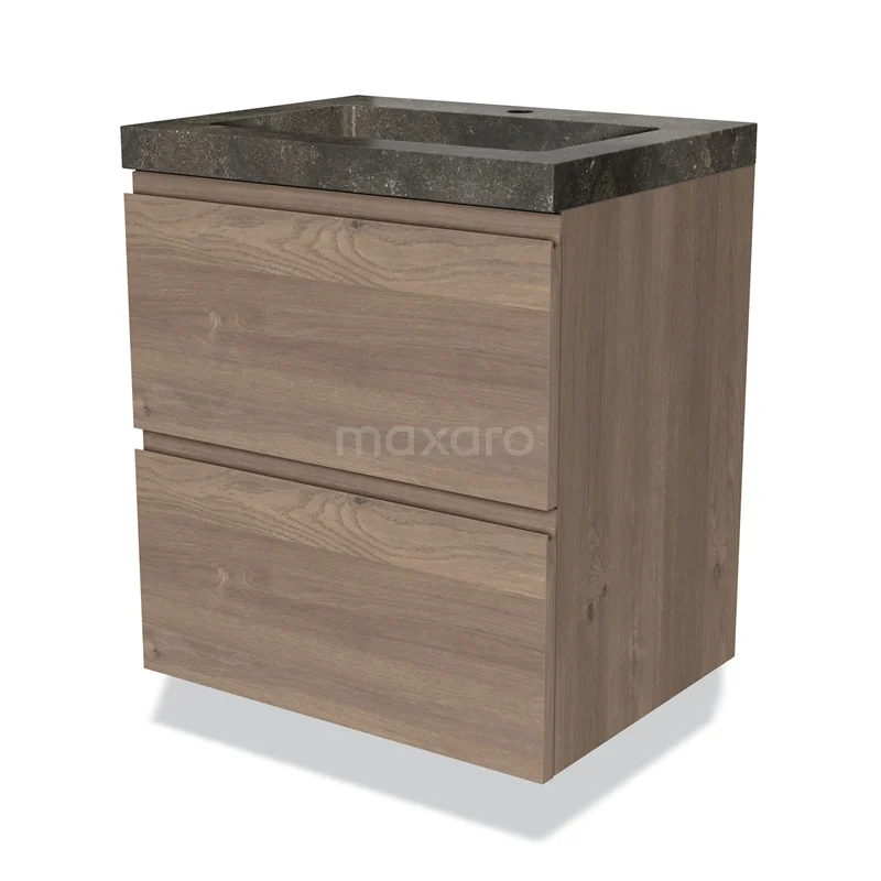 Badmöbel 60cm Modulo mittelbraune Eiche 2 Schubladen griffloses Waschbecken Naturstein blau