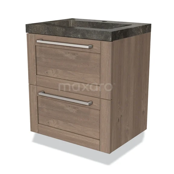 Badmöbel 60cm Modulo mittelbraune Eiche 2 Schubladen Rahmen Waschbecken Naturstein Blaustein