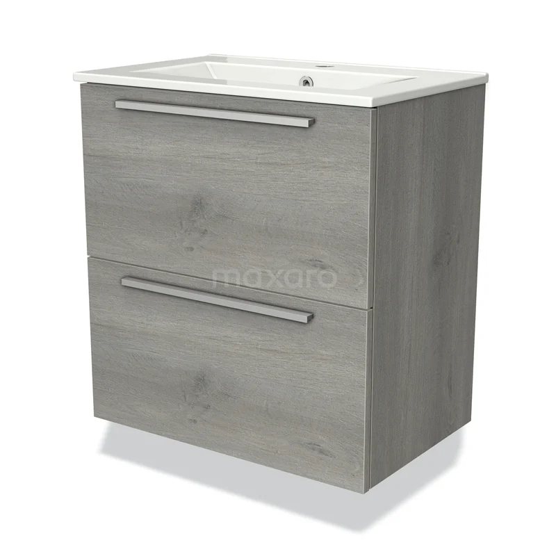 Badmöbel 60cm Modulo Slim Graue Eiche 2 Schubladen Flaches Waschbecken aus Keramik