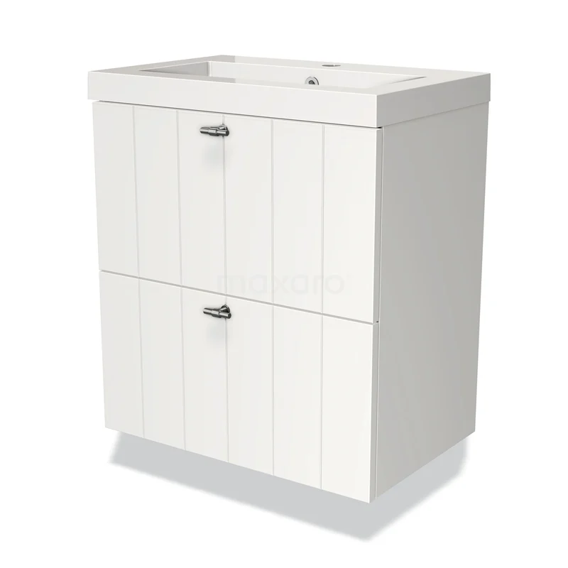 Weiße Badmöbel mit zwei Soft-Close Schubladen, vertikalen Linien und keramischem Waschbecken, ideal für moderne Bäder.