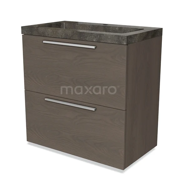 Badmöbel 80cm Modulo dunkelbraune Eiche 2 hohe Schubladen Flaches Waschbecken Naturstein Blaustein