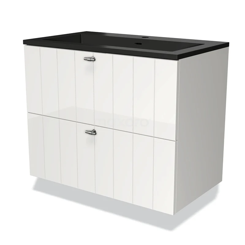 Weißes Badezimmermöbel mit schwarzer Waschtischplatte, zwei Schubladen, moderne Verarbeitung und vertikalen Linien für ein stilvolles Badezimmer.