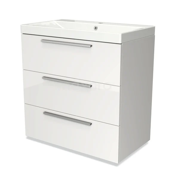 Badmöbel 80cm Modulo Hochglanz Weiß 3 Schubladen Flaches Waschbecken aus Keramik
