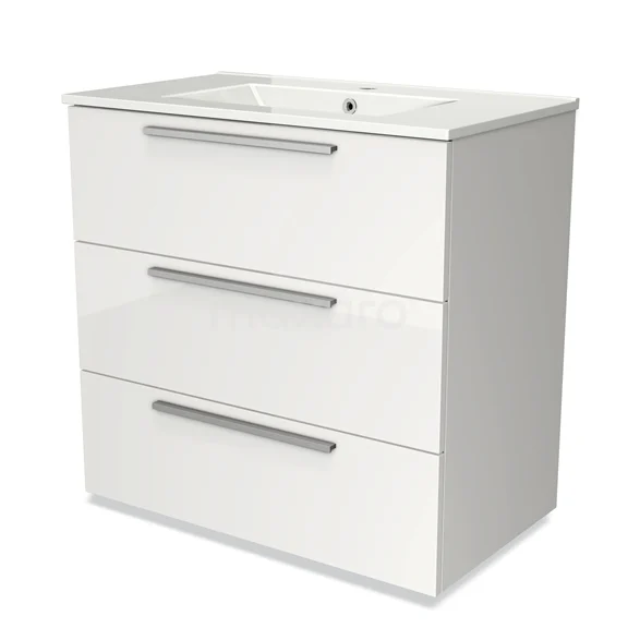 Badmöbel 80cm Modulo Hochglanz Weiß 3 Schubladen Flaches Waschbecken aus Keramik