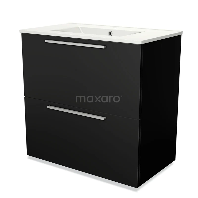 Badmöbel 80cm Modulo Matt Schwarz 2 hohe Schubladen Flaches Waschbecken aus Keramik