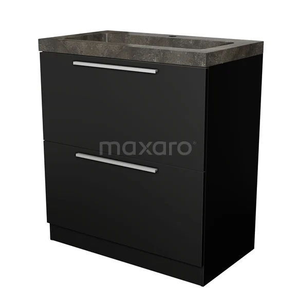 Badmöbel 80cm Modulo Matt Schwarz 2 hohe Schubladen stehende Schubladen flaches Waschbecken Naturstein Blaustein